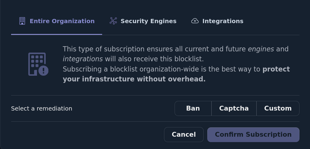 The simplest way to subscribe to a blocklist is at the organization level. This will apply the blocklist to all Security Engines and Integrations within the organization this will include current and future Security Engines and Integrations.