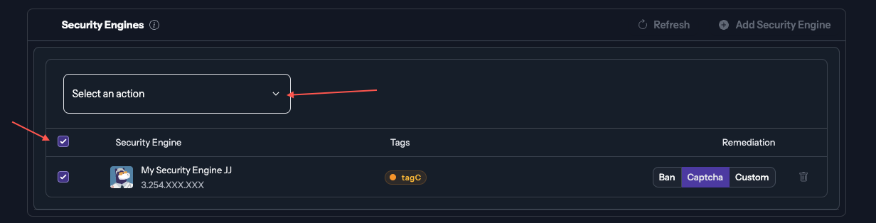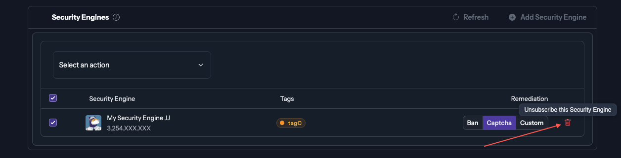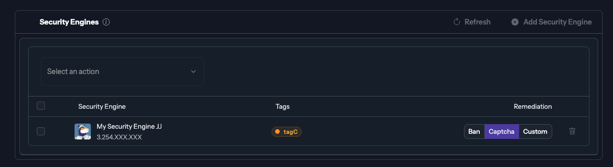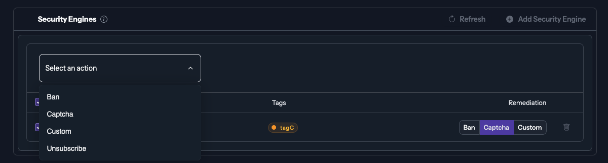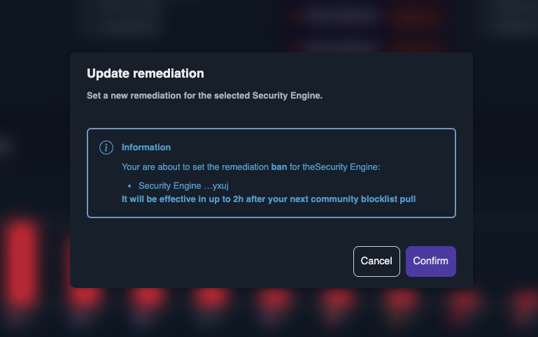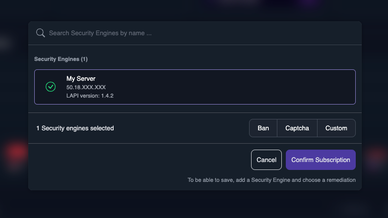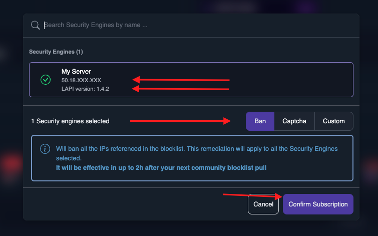 The popup will allow you to configure which engines will subscribe to the blocklist and what remediation will be applied to the IPs listed that are trying to reach your server.